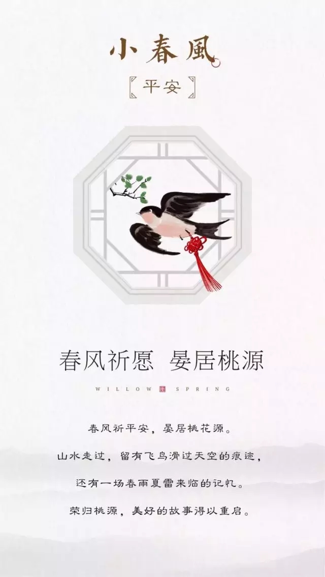 小春風(fēng),以詩意的水墨風(fēng),將象征著生機(jī)、活力、美好與希望的春天收藏在這一座“都市桃花源”之中,寓意著春天的種種美好、春天般的幸福生活能夠常駐于此。