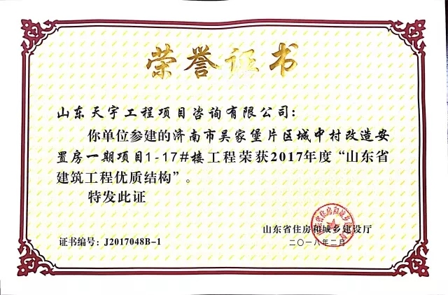 質(zhì)量是企業(yè)的生命。在山東省住房和城鄉(xiāng)建設(shè)廳組織的2017年度“山東省建筑工程優(yōu)質(zhì)結(jié)構(gòu)”評審中,吳家堡片區(qū)安置房一期工程1#到17#樓(共計17棟樓),憑借過硬的質(zhì)量、完善的管理順利通過專家考評,喜獲“山東省建筑工程優(yōu)質(zhì)結(jié)構(gòu)”。“山東省建筑工程優(yōu)質(zhì)結(jié)構(gòu)”代表著全省各建筑企業(yè)施工質(zhì)量管理的領(lǐng)先水平,為沖刺山東省建筑工程質(zhì)量最高榮譽“泰山杯”奠定了基礎(chǔ)。