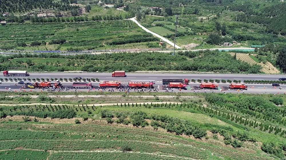 這個看上去像列車的專用設備,在業(yè)內被稱為“公路醫(yī)生”,它先要對整個道路進行全方位深度探測、分析,通過“望聞問切”查出高速公路到底有哪些毛病,需要補充哪些材料,最后才是施工階段。因為施工采取的是流水線作業(yè),機械化程度高,機組的施工速度很快?,F場工作人員稱,施工最快時可以達到6米/分鐘,施工效率較過往的傳統(tǒng)工藝提高了3倍以上。有關試驗數據表明,和傳統(tǒng)工藝施工后瀝青層界面的抗剪強度對比,使用就地熱再生工藝施工后,路面的抗剪強度提高了2至3倍。