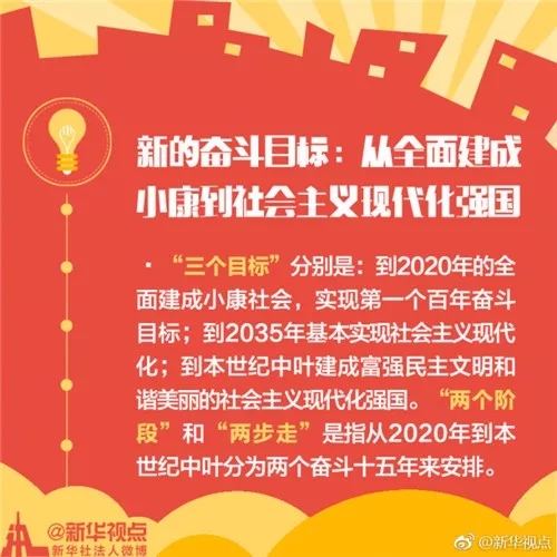 在新世紀(jì)新時(shí)代,經(jīng)濟(jì)和社會(huì)發(fā)展的戰(zhàn)略目標(biāo)是,到建黨一百年時(shí),全面建成小康社會(huì);到新中國(guó)成立一百年時(shí),全面建成社會(huì)主義現(xiàn)代化強(qiáng)國(guó)。