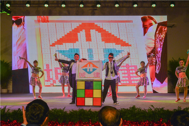 在歡快喜悅的歌舞《拜新年》中,匯演拉開序幕,紅紅火火的舞臺,映射著蒸蒸日上的發(fā)展勢頭。舞蹈《成長》《奮進》以激昂的音樂,吹響了催人奮進的號角,用動感的舞步,舞出了城建鐵軍的蓬勃朝氣。《馬路情緣》《鐵軍男相親記》《生日》《真相》《男爭女辯》《筑夢同行》等語言類節(jié)目圍繞生產經營精心編排,真實感人,催人奮進。勵志感人的歌曲,絢麗多彩的歌伴舞,酷炫的舞蹈,神秘的魔術,魔幻的黑光劇,生龍活虎的京劇,讓觀眾著實過了一把眼癮,臺下掌聲不斷,歡欣喜悅的氣氛一浪高過一浪。小品里父母、妻子、孩子那一段段心里話,令人感同身受,潸然淚下,家屬們用實際行動表達了對企業(yè)最大的理解和支持,大家在這個溫暖的大家庭中,以誠相待,溫馨彼此。在激動人心的歌舞串燒《開創(chuàng)未來》中,匯演圓滿落下帷幕,集團領導與演職人員合影留念。