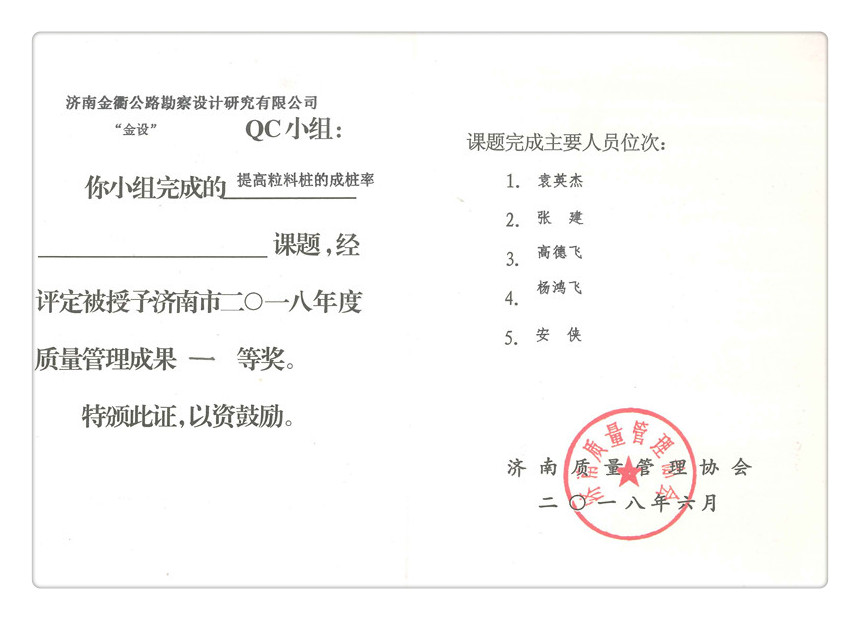 近日,濟(jì)南質(zhì)量管理協(xié)會(huì)組織召開(kāi)了2018年度全市群眾性質(zhì)量管理活動(dòng)經(jīng)驗(yàn)交流會(huì),表彰群眾性質(zhì)量管理活動(dòng)中涌現(xiàn)出的優(yōu)秀QC小組、質(zhì)量信得過(guò)班組、先進(jìn)工作者及優(yōu)秀QC成果。金衢公司成立“金設(shè)”QC小組參與評(píng)選,申報(bào)的多個(gè)課題受到表彰:其中“提高粒料樁的成樁率”課題榮獲“濟(jì)南市2018年度質(zhì)量管理成果”一等獎(jiǎng);“提高路面結(jié)構(gòu)內(nèi)部排水效率”課題榮獲“濟(jì)南市2018年度質(zhì)量管理成果”二等獎(jiǎng);“公路路基滑坡治理研究”、“提高公路設(shè)計(jì)工作的效率”、“有效防止小箱梁支座脫空現(xiàn)象”、“提高后期服務(wù)滿(mǎn)意率”四個(gè)課題分別榮獲“濟(jì)南市2018年度質(zhì)量管理成果”三等獎(jiǎng);同時(shí),金衢公司設(shè)計(jì)一室、設(shè)計(jì)二室被授予“濟(jì)南市2018年度質(zhì)量信得過(guò)班組”榮譽(yù)稱(chēng)號(hào),劉騰、王敏、張偉偉三人被授予“2018年濟(jì)南市優(yōu)秀質(zhì)量管理工作者稱(chēng)號(hào)”。