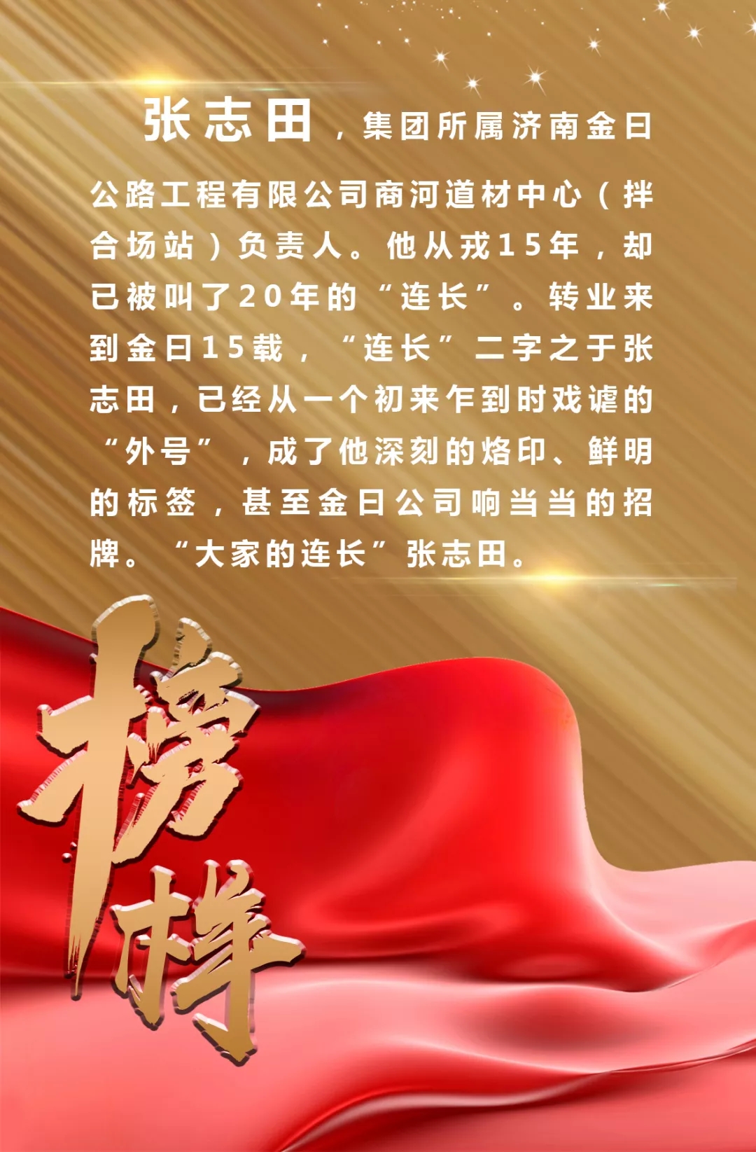 轉(zhuǎn)業(yè)來(lái)到金曰后,他主動(dòng)要求到工程建設(shè)一線工作,因?yàn)?ldquo;在辦公室坐不住,在部隊(duì)時(shí)也是這樣”。2005年底,他來(lái)到公司濟(jì)菏項(xiàng)目部,報(bào)到的第一天,當(dāng)時(shí)的項(xiàng)目總工劉志民便給他起了“連長(zhǎng)”這個(gè)稱呼:“軍轉(zhuǎn)干部很少有人肯到項(xiàng)目一線,這里需要鐵打的軍人作風(fēng),雖然你是營(yíng)級(jí)干部,但連長(zhǎng)更順口,以后就叫你連長(zhǎng)吧。”當(dāng)時(shí),正值海棠花開,張志田的辦公桌上放著一盆盛開的海棠花,項(xiàng)目部同事王安娜為他抓拍了一張工作照,把照片投到了公司內(nèi)部報(bào),并為照片命名“連長(zhǎng)之花”,自此,張志田“連長(zhǎng)”的稱呼便在整個(gè)公司傳了開來(lái)。