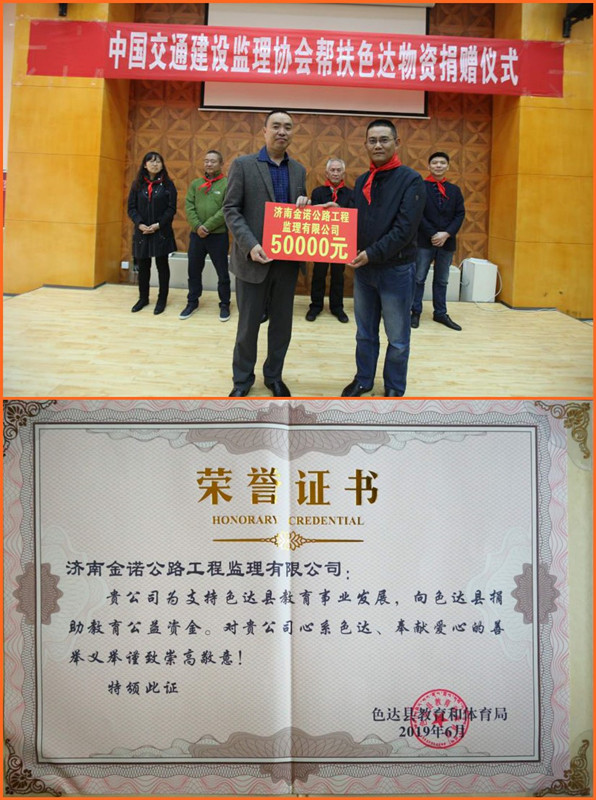 積極參與脫貧攻堅(jiān)事業(yè)是一個(gè)有社會(huì)責(zé)任感的企業(yè)服務(wù)社會(huì)、回報(bào)社會(huì)的重要體現(xiàn)。不忘初心,牢記使命,濟(jì)南金諾公路工程監(jiān)理有限公司作為中國(guó)交通監(jiān)理協(xié)會(huì)的理事單位,將持之以恒的為貧困地區(qū)脫貧攻堅(jiān)事業(yè)貢獻(xiàn)力量,持續(xù)關(guān)注色達(dá)孩子的教育和成長(zhǎng),盡企業(yè)的綿薄之力,為社會(huì)和諧進(jìn)步和民族團(tuán)結(jié)和諧貢獻(xiàn)力量。