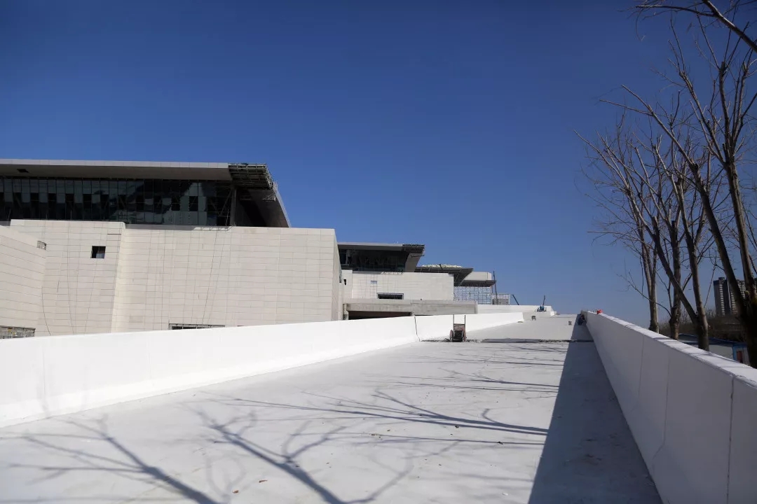 項(xiàng)目建成后,主入口位于展館西側(cè)的共享大廳,南北向的5個(gè)展館通過共享大廳相通,目前共享大廳的玻璃幕墻已安裝完畢,每塊玻璃都按照固定編號(hào)依次安裝,不同弧度的玻璃面完美拼接,將大廳的流動(dòng)設(shè)計(jì)感盡顯無疑。共享大廳外立面的LED大屏頗為搶眼,高約8米、長約43米的LED大屏日后將用于不同展館布展介紹情況等宣傳使用。在室外部分,正在進(jìn)行廣場綠化和管道鋪設(shè)等施工,工人們有條不紊地完善著室外施工細(xì)節(jié)。