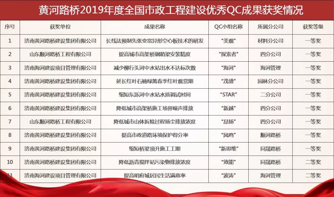 濟南黃河路橋建設集團有限公司共有11項成果參與發(fā)布,其中9項成果榮獲一等獎,2項成果榮獲二等獎;同時黃河路橋建設集團被評為2019年“全國市政工程建設QC小組活動優(yōu)秀企業(yè)”,這是自2013年以來連續(xù)七年獲得此項殊榮。