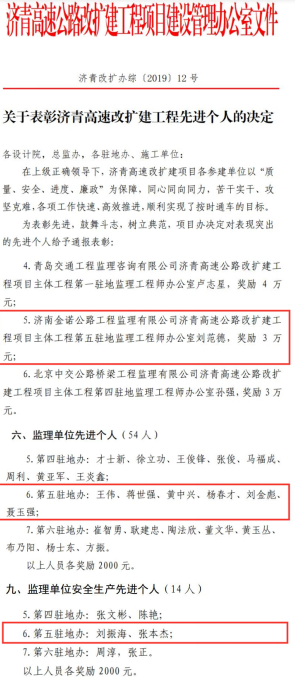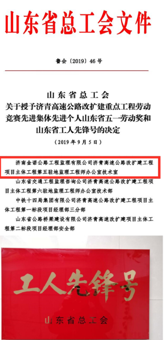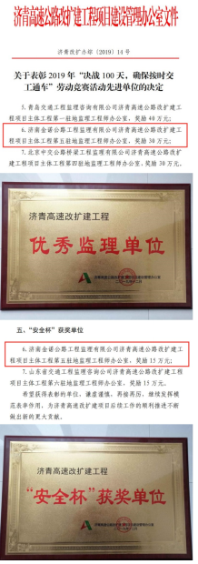 近日,由濟(jì)南城市建設(shè)集團(tuán)所屬濟(jì)南金諾公路工程監(jiān)理有限公司承建的濟(jì)青高速第五駐地辦榮獲2019年山東省總工會(huì)“工人先鋒號(hào)”榮譽(yù)稱號(hào), 同時(shí),在2019年度該項(xiàng)目“決戰(zhàn)100天,確保按時(shí)交工通車”勞動(dòng)競(jìng)賽活動(dòng)中表現(xiàn)突出,榮獲2019年濟(jì)青高速改擴(kuò)建工程“優(yōu)秀監(jiān)理單位”、“安全杯”獲獎(jiǎng)單位榮譽(yù)稱號(hào);其中,項(xiàng)目負(fù)責(zé)人獲得“優(yōu)秀駐地監(jiān)理工程師”稱號(hào), 6位同志獲得“監(jiān)理單位先進(jìn)個(gè)人”稱號(hào), 2位同志獲得“監(jiān)理單位安全生產(chǎn)先進(jìn)個(gè)人” 稱號(hào),共獲得專項(xiàng)獎(jiǎng)勵(lì)49.6萬(wàn)元。