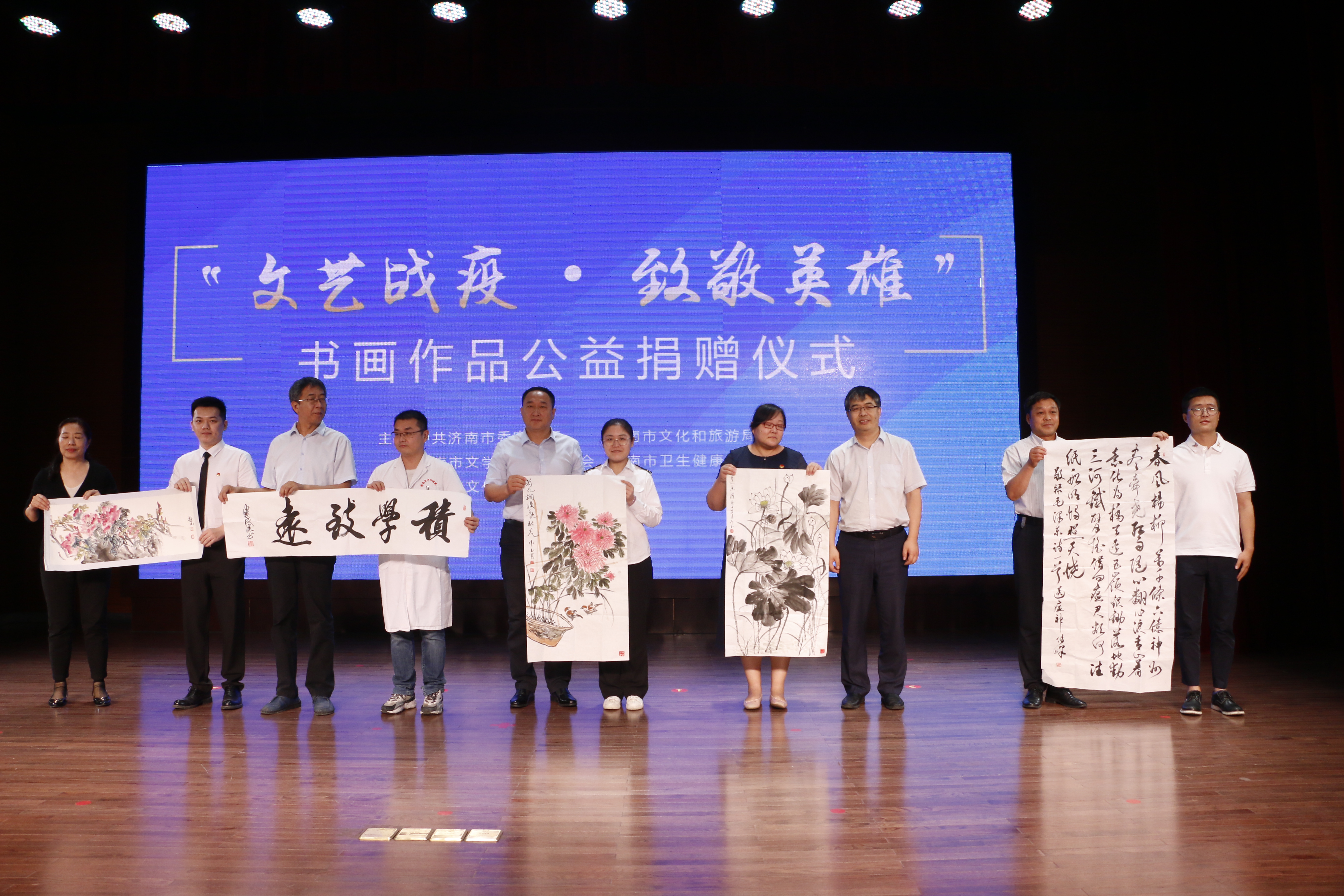為進一步加強疫情防控宣傳工作,充分發(fā)揮濟南市文藝戰(zhàn)線優(yōu)勢作用,用文藝的形式向抗擊疫情一線英雄致敬,6月9日,由市委宣傳部、市文化和旅游局、市文學藝術界聯(lián)合會、市衛(wèi)生健康委員會主辦,市文化館承辦的“文藝戰(zhàn)疫·致敬英雄”濟南市書畫作品公益捐贈儀式在市文化館多功能廳舉行。市委宣傳部、市文化和旅游局、市文聯(lián)、市衛(wèi)健委等主承辦單位相關負責同志以及書畫作品捐贈藝術家代表、援鄂醫(yī)護工作者等抗擊疫情一線的各界代表共計80余人參加活動。