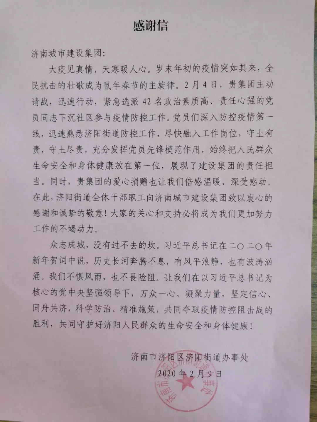 濟陽街道辦事處專門給集團寫了感謝信,濟陽街道康瑞社區(qū)與雅居園物業(yè)管理有限公司還向呂仁鎮(zhèn)、齊鵬飛兩名黨員同志贈送了寫有“抗擊疫情勇?lián)?dāng),志愿服務(wù)爭先鋒”的錦旗。