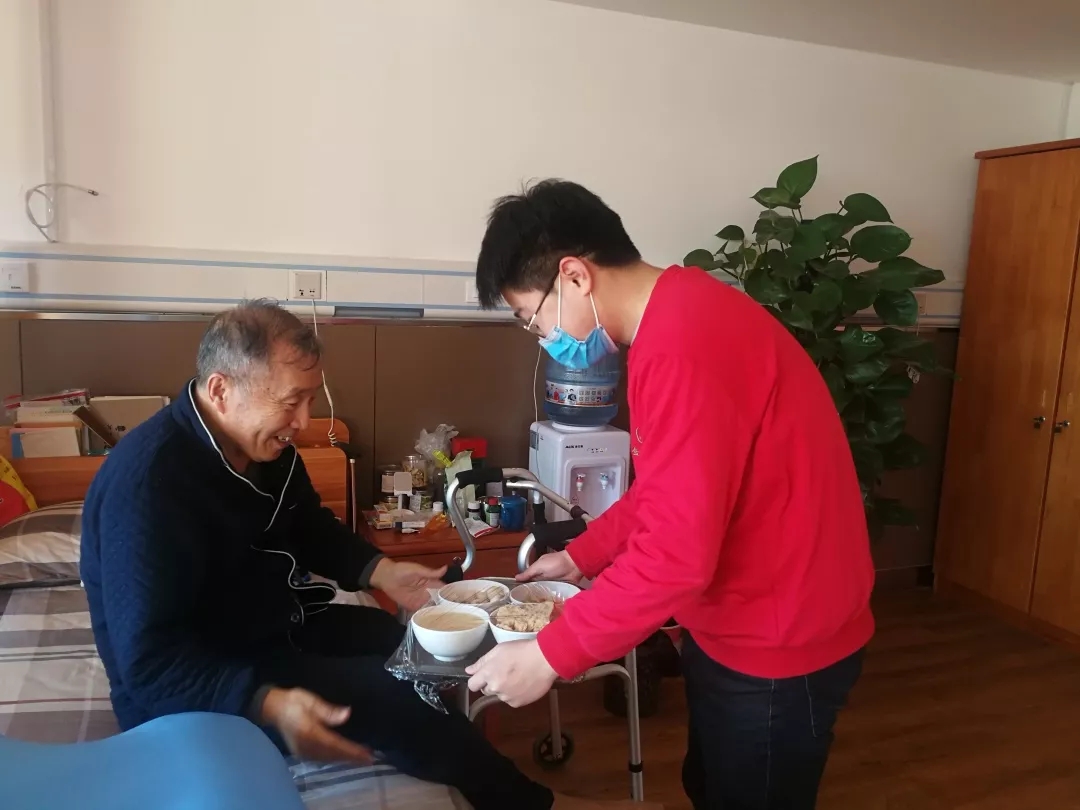 在介護(hù)區(qū),我們還看到了兩位正在忙碌的“95后”小伙子。97年出生的陳安義,家住德州,本來已經(jīng)買好了回家的車票,接到抗擊疫情的通知,第一時(shí)間退了車票主動(dòng)請(qǐng)戰(zhàn)。98年出生的欒希浩,老家在煙臺(tái),也是放棄了春節(jié)假期,跟陳安義兩人共同負(fù)責(zé)介護(hù)區(qū)二樓的四戶長(zhǎng)者。