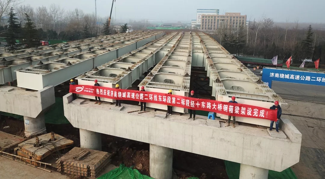 1月18日,濟南繞城高速公路二環(huán)線東環(huán)段二標段(濟南“大東環(huán)”)互通主線橋跨經十路鋼箱梁順利合攏。至此,項目跨越經十東路大橋鋼箱梁架設工作全部完成,為實現年底通車的目標打下了良好基礎。