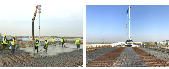 該標(biāo)段全線10kV以上高壓線共計(jì)15條影響主線2400米施工,項(xiàng)目部多措并舉順利攻克難關(guān),大力推進(jìn)施工進(jìn)展。自項(xiàng)目開工以來,北岸引橋4#墩一直受上空高壓電纜制約施工,項(xiàng)目部多次勘探現(xiàn)場,編制專項(xiàng)施工方案。樁基鉆孔采用循環(huán)鉆開挖,為避免觸電危險(xiǎn)的發(fā)生,設(shè)備上方鋪蓋絕緣板后施工;扣除吊裝高度,樁基鋼筋籠全部采用2米一段,于鉆孔內(nèi)進(jìn)行連接拼裝;線改后為了迅速形成強(qiáng)度,4#墩下部結(jié)構(gòu)混凝土強(qiáng)度標(biāo)號(hào)提升至C40。