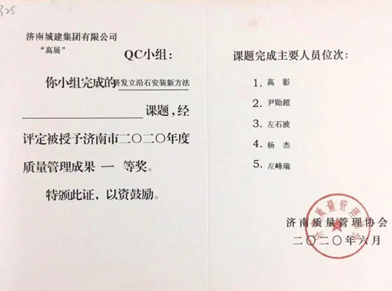 經(jīng)濟(jì)南質(zhì)量管理協(xié)會(huì)專家組評(píng)審,濟(jì)南城建集團(tuán)有限公司報(bào)送的QC成果榮獲一等獎(jiǎng)5項(xiàng)、二等獎(jiǎng)4項(xiàng),濟(jì)南城建集團(tuán)有限公司的城市隧道項(xiàng)目班組、701項(xiàng)目班組、盾構(gòu)施工管理班組、804項(xiàng)目班組等共有7個(gè)班組榮獲“2020年度濟(jì)南市質(zhì)量信得過(guò)班組”稱號(hào)。另外,張勝安等3名員工獲得“2020年度濟(jì)南市優(yōu)秀質(zhì)量管理先進(jìn)工作者”稱號(hào)。