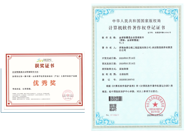 2020年,金諾公司與西安凱悅軟件有限責(zé)任公司合作,研發(fā)了“金諾智慧通”企業(yè)管理軟件,于2020年12月取得中國版權(quán)保護(hù)中心頒發(fā)的軟件著作權(quán)登記證書。“金諾智慧通”參加了第一屆中國(山東)數(shù)字經(jīng)濟優(yōu)秀項目(產(chǎn)品)大賽,并獲得產(chǎn)品組“優(yōu)秀獎”。同時,2020年下半年推動的針對公路工程建設(shè)開發(fā)的“路面三維剖面破損(病害)自動檢測系統(tǒng)”、“橋梁在線監(jiān)測系統(tǒng)”等8個軟件已申報軟件著作權(quán)登記,軟件著作權(quán)登記證書已于2021年3月份下發(fā)。