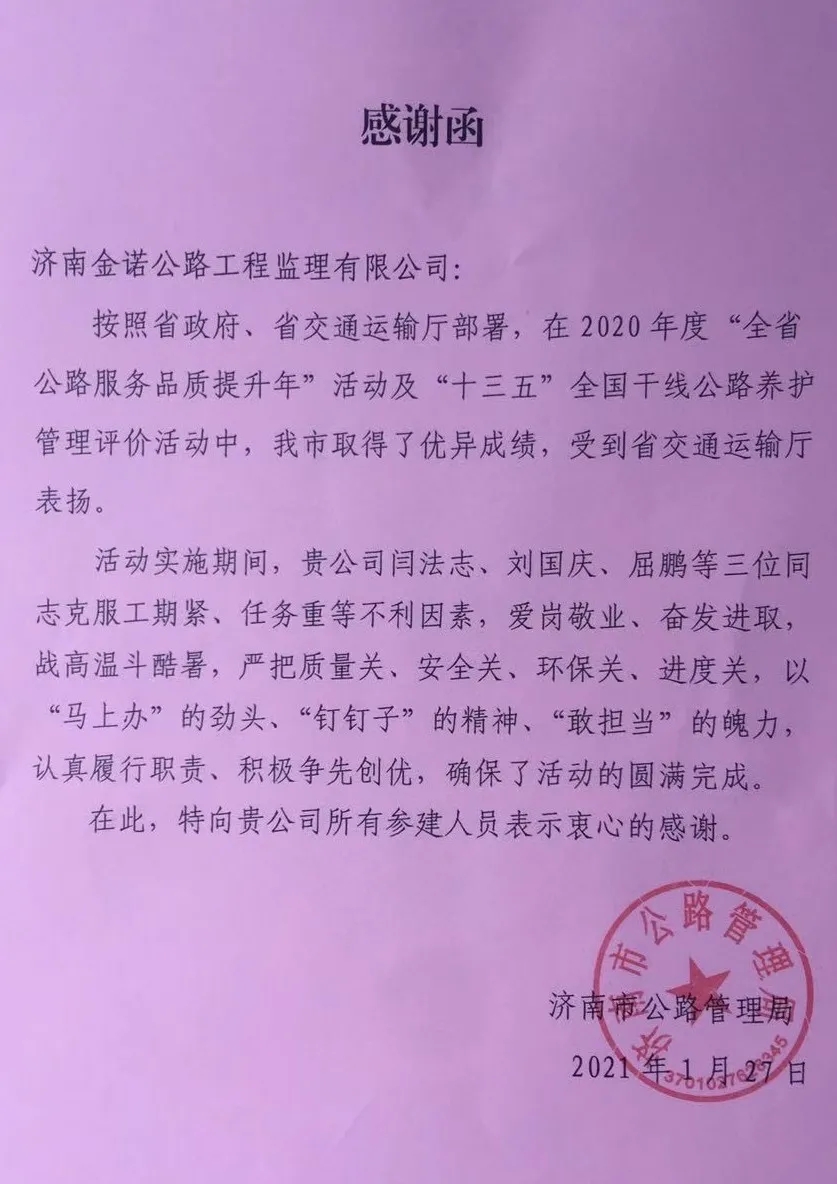 近日,濟(jì)南市公路管理局向金諾公司發(fā)來了《感謝函》,向金諾公司所有參建人員在2020年度“全省公路服務(wù)品質(zhì)提升年”活動(dòng)及“十三五”全國干線公路養(yǎng)護(hù)管理評(píng)價(jià)活動(dòng)中,認(rèn)真履行職責(zé)、積極爭先創(chuàng)優(yōu)的工作作風(fēng)表示感謝。