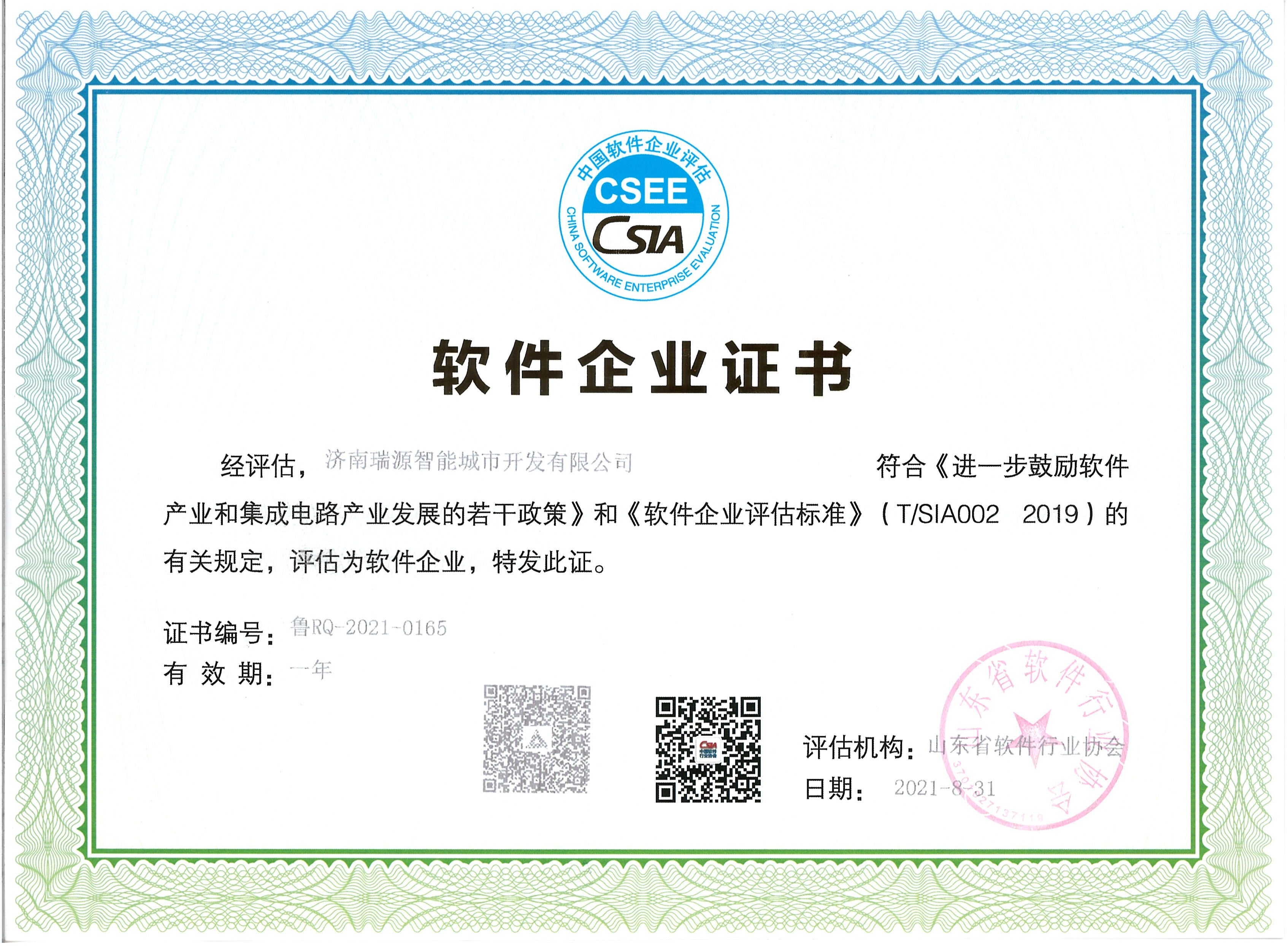 8月31日,濟南瑞源智能城市開發(fā)有限公司經(jīng)山東省軟件行業(yè)協(xié)會評估,符合《進一步鼓勵軟件產(chǎn)業(yè)和集成電路產(chǎn)業(yè)發(fā)展的若干政策》和《軟件企業(yè)評估標準》的有關規(guī)定,獲評軟件企業(yè)證書。此證書獲得,標志著公司在技術研發(fā)、軟件應用等相關領域獲得了行業(yè)認證資質(zhì),更是對公司技術先進性和前沿性的充分認可。