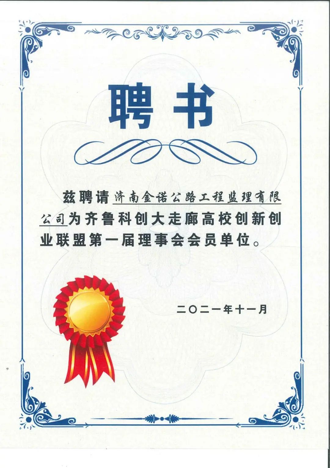 近日,齊魯科創(chuàng)大走廊高校創(chuàng)新創(chuàng)業(yè)聯(lián)盟成立大會在山東青年政治學院召開,濟南金諾公路工程監(jiān)理有限公司當選為第一屆理事會會員單位。