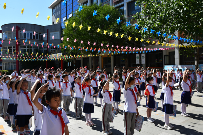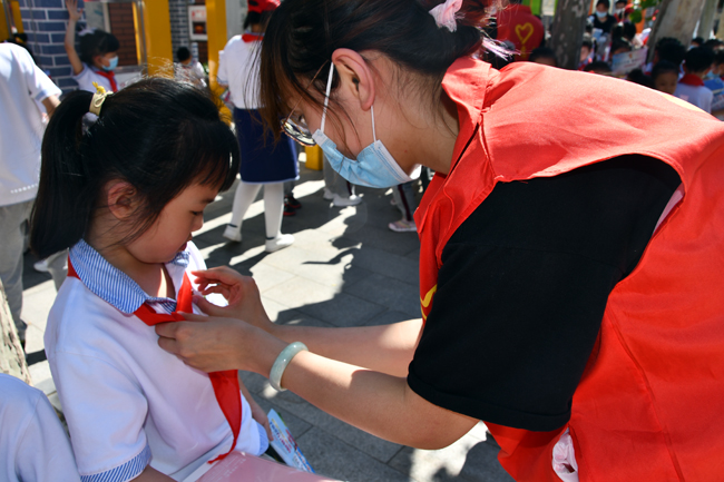 活動中,志愿者身著紅色志愿者馬甲,與小朋友們進行親密互動,為孩子們佩戴少先隊隊徽,以通俗易懂的方式為大家講解少先隊知識、安全防疫知識,提醒提高安全防護意識。志愿者們與小朋友們有說有笑,其樂融融,為小朋友們送去集團的關(guān)愛和祝福,祝愿孩子們開心快樂成長。孩子們用整齊的少先隊禮回應(yīng)志愿者,稚嫩的童顏上洋溢著燦爛的笑容。