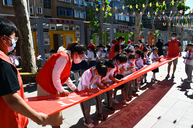 活動最后,小朋友們在“以團帶隊 薪火相傳 安全‘童 ’行 ”的條幅上簽上自己的名字,胸帶少先隊徽,一筆一畫的認真書寫,鮮艷的紅色條幅映紅了孩子們的臉龐,在孩子心中播種下美好的種子。
