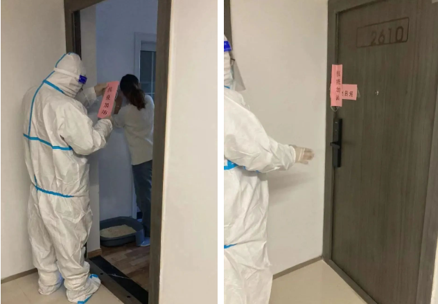 當(dāng)柏然公館項(xiàng)目收到業(yè)主需要居家隔離的通知,福仁服務(wù)人員身穿防護(hù)服,上門(mén)耐心溝通安撫,“遇到事情需要代辦的,東西需要代買(mǎi)的,隨時(shí)打電話找我們!我們24小時(shí)為你開(kāi)機(jī)!”