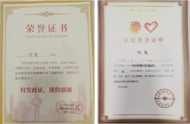 在疫情防控期間,何倩主動請纓,逆行出征,協(xié)助桿石橋街道完成核酸檢測、物資搬運等疫情防控工作,得到了社區(qū)的高度認可。
