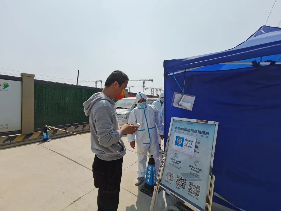 在濟(jì)南市新舊動(dòng)能轉(zhuǎn)換起步區(qū)大橋安置五區(qū)項(xiàng)目入口,幾名身穿防護(hù)服的工作人員嚴(yán)格對(duì)進(jìn)出場人員進(jìn)行信息自動(dòng)化登記和健康信息核驗(yàn)。