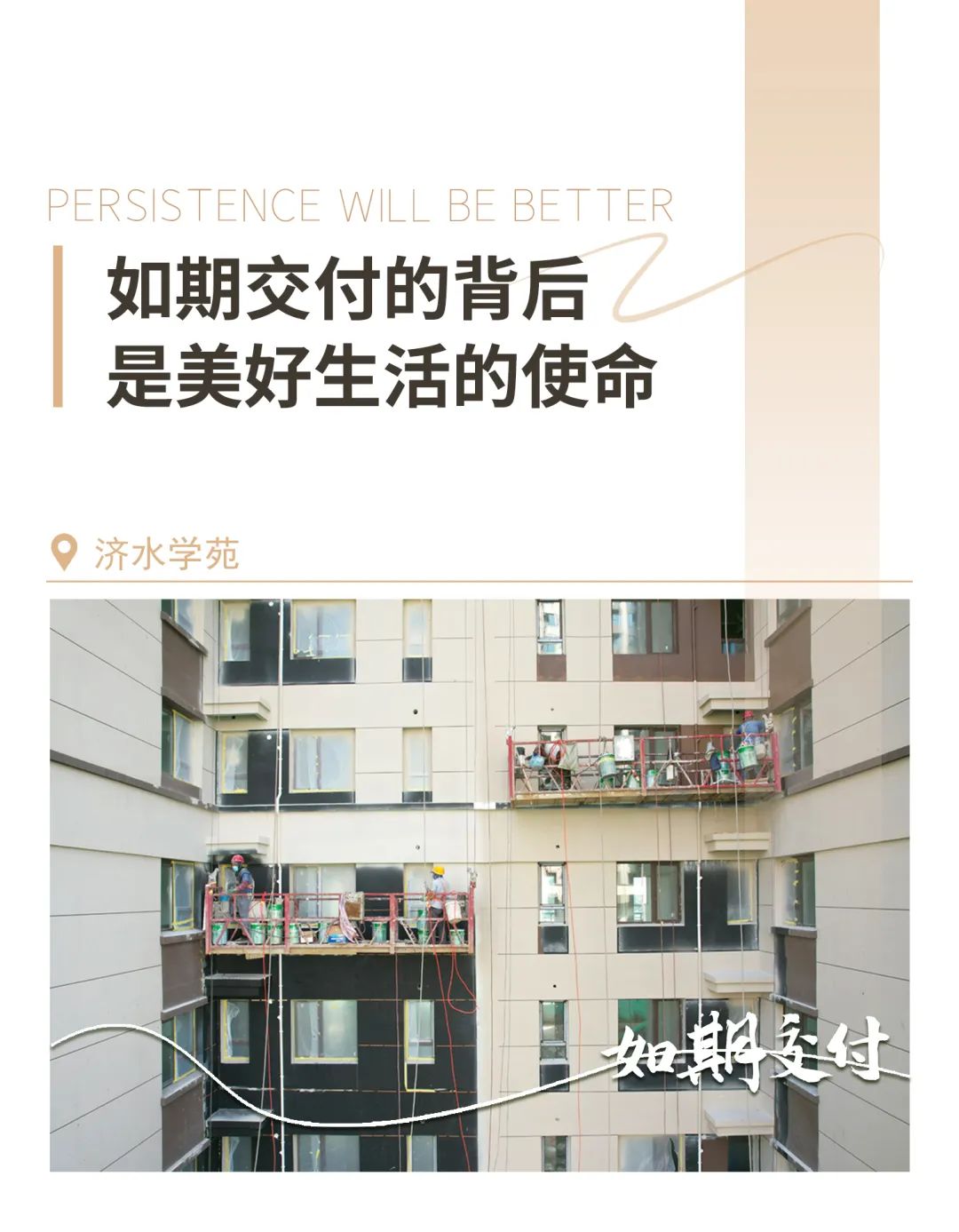 克服疫情等不利因素,迎難而上、通力合作,7個多月、200余個日日夜夜、5000多個小時,堅守一線決戰(zhàn)攻堅,多舉措保工期、保進(jìn)度、保品質(zhì),順利完成濟(jì)水別苑一期各項建設(shè)工作。
