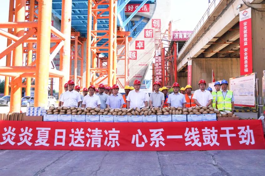 活動(dòng)中,史海成一行先后前往 G104 濟(jì)南黃河公路大橋擴(kuò)建項(xiàng)目、黃河體育中心專業(yè)足球場(chǎng)項(xiàng)目,詳細(xì)了解了現(xiàn)場(chǎng)施工進(jìn)度、工程質(zhì)量、安全文明施工等情況,并與一線員工親切交流,感謝他們長期以來為項(xiàng)目建設(shè)及企業(yè)發(fā)展作出的貢獻(xiàn),為一線員工發(fā)放防暑降溫物資。