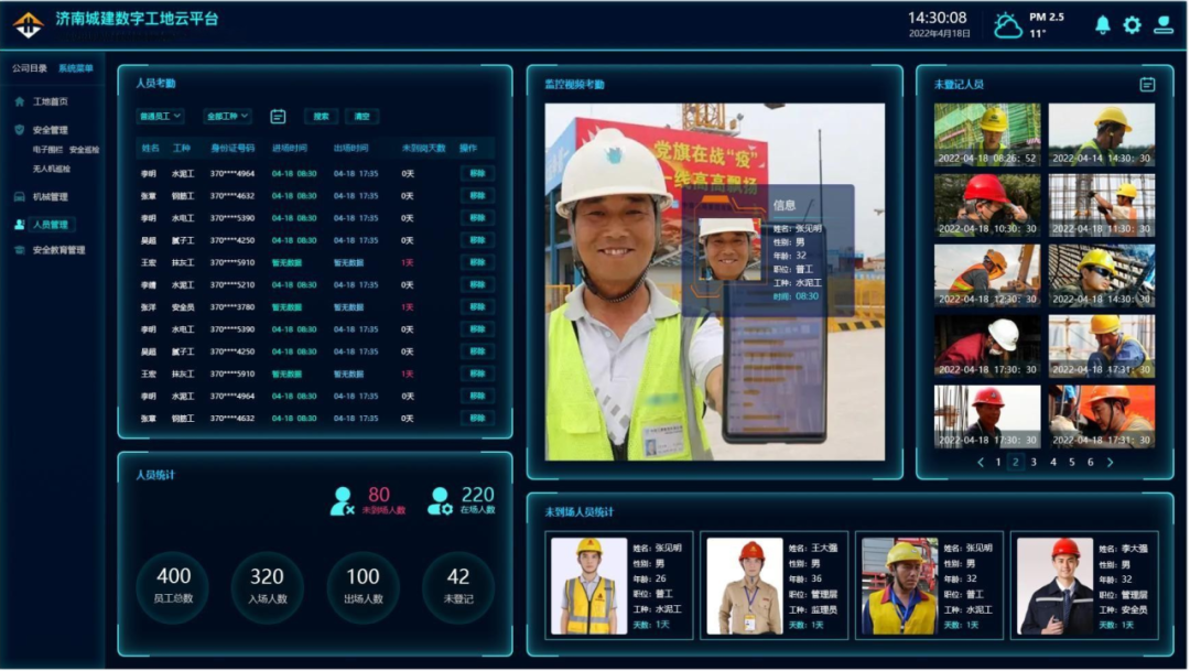 人員管理實(shí)現(xiàn)優(yōu)化,G104京嵐線濟(jì)南黃河公路大橋擴(kuò)建工程項(xiàng)目應(yīng)用智能化勞務(wù)人員管理系統(tǒng),系統(tǒng)根據(jù)視頻采樣,可以實(shí)時(shí)定位,統(tǒng)計(jì)當(dāng)日出勤人數(shù),能夠針對不系安全帶、不正確佩戴安全防護(hù)用品,違章動(dòng)火作業(yè)等進(jìn)行智能識別,并抓拍報(bào)警。系統(tǒng)累計(jì)保障工地安全620天,累計(jì)錄入工人800余人,攝像頭安裝17個(gè),避免了火災(zāi),機(jī)械違規(guī)載人,安全用品佩戴不規(guī)范,防護(hù)缺失等隱患發(fā)生。