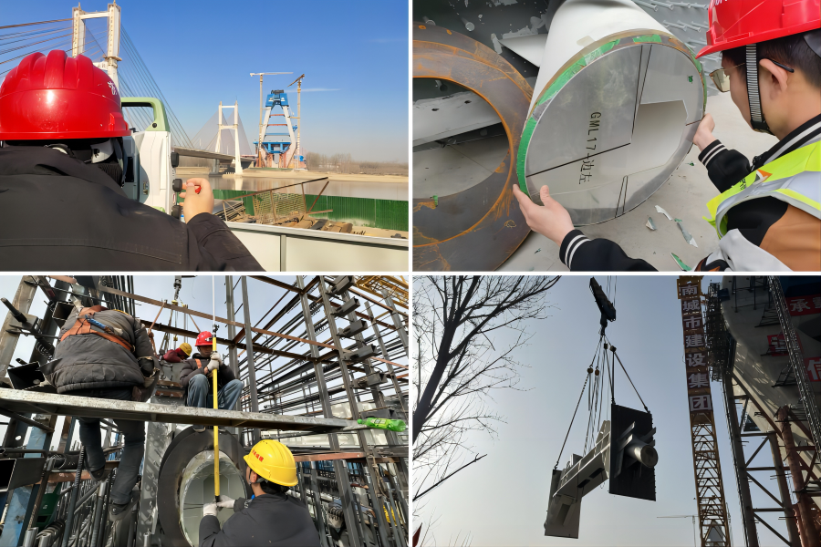 主塔上塔柱鋼錨梁共17對,單個最大重量9.3噸,索導(dǎo)管長度最大達(dá)5.4米。項(xiàng)目部根據(jù)導(dǎo)管尺寸,專門設(shè)計(jì)定制管口測量工裝,在鋼錨梁吊裝前安裝定位工裝,實(shí)現(xiàn)吊裝動態(tài)觀測,將“隱形點(diǎn)”可視化,保證了預(yù)埋準(zhǔn)確度,大幅提升施工作業(yè)工效。