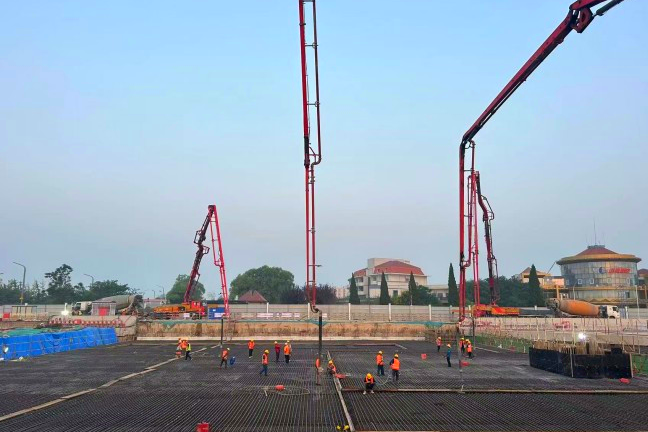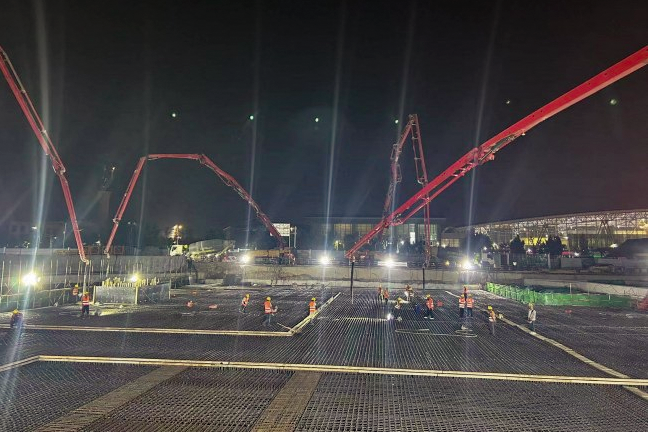 本次澆筑從9月6日22時(shí)開始,歷時(shí)30小時(shí),4臺(tái)泵車聯(lián)合作戰(zhàn),順利澆筑完成3800立方米混凝土。為完成施工區(qū)域道路導(dǎo)改及管線遷改,臨八路人防頂板先行施工,人防蓋板由鋼管柱支撐,長度49米,寬度73.5米,蓋板下主體結(jié)構(gòu)及土方施工采用蓋挖法施工,結(jié)構(gòu)主體采用C45P8抗?jié)B混凝土。