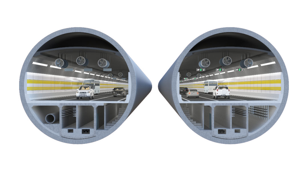 為減少市政管線(xiàn)過(guò)黃河成本,充分利用市政隧道下部通道資源搭載穿黃河市政管線(xiàn),隧道下部預(yù)留穿黃河市政管線(xiàn)艙。同時(shí),盾構(gòu)段采用在車(chē)行道路面下設(shè)置逃生疏散樓梯與專(zhuān)用逃生救援通道(縱向逃生救援方案),并結(jié)合工作井設(shè)置車(chē)行橫通道、明挖暗埋段設(shè)置人行橫通道的縱向結(jié)合橫向疏散救援的綜合方案,形成可靠高效的疏散救援設(shè)施,確保運(yùn)行安全。