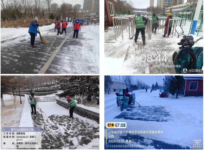 濟(jì)南城市建設(shè)集團(tuán)園區(qū)管理有限公司提前做出預(yù)判并發(fā)布相應(yīng)通知,為惡劣天氣應(yīng)急管理做好全面準(zhǔn)備。華山、濟(jì)西濕地、濟(jì)南園博園三大景區(qū)及時(shí)響應(yīng)、迅速行動(dòng),全力組織開展掃雪除冰工作,利用掃雪車、雪鍬、雪鏟等工具,對(duì)景區(qū)內(nèi)各出入口、廣場、道路臺(tái)階等重點(diǎn)部位進(jìn)行清雪、清冰工作并鋪設(shè)相應(yīng)防滑措施,保障道路暢通與市民游客安全,最大限度減少低溫雨雪天氣影響。