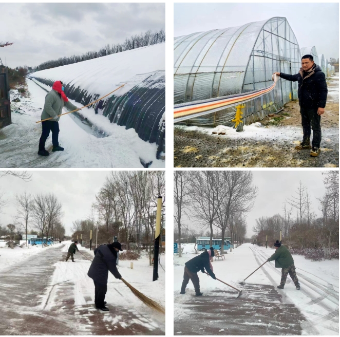山東濟(jì)西濕地生態(tài)農(nóng)場有限公司提前組織人員檢修溫室大棚設(shè)施,保證正常運(yùn)轉(zhuǎn),同時(shí),加強(qiáng)棚內(nèi)保溫,指導(dǎo)租戶及時(shí)關(guān)閉放風(fēng)口、防風(fēng)保溫。加強(qiáng)值守和巡查,做到隨下隨清,尤其注意加強(qiáng)夜間除雪,避免積雪或冰層過厚壓塌棚室,及時(shí)清理園內(nèi)主次干道積雪,確保道路通暢。