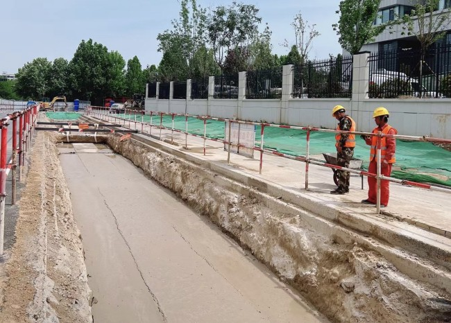 在濟南高新區(qū)章錦片區(qū)路網(wǎng)完善工程總承包項目創(chuàng)新應用新型材料流態(tài)固化土,利用工程棄土摻入一定量的專用固化劑加水拌合均勻后形成可泵送、自流平、自密實且凝固后能達到一定強度的新型建筑材料,具有施工速度快、耐久性強,收縮性小、滲透性低,物盡其用、變廢為寶等優(yōu)勢。