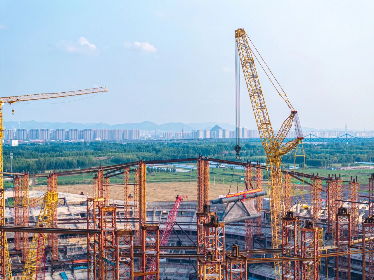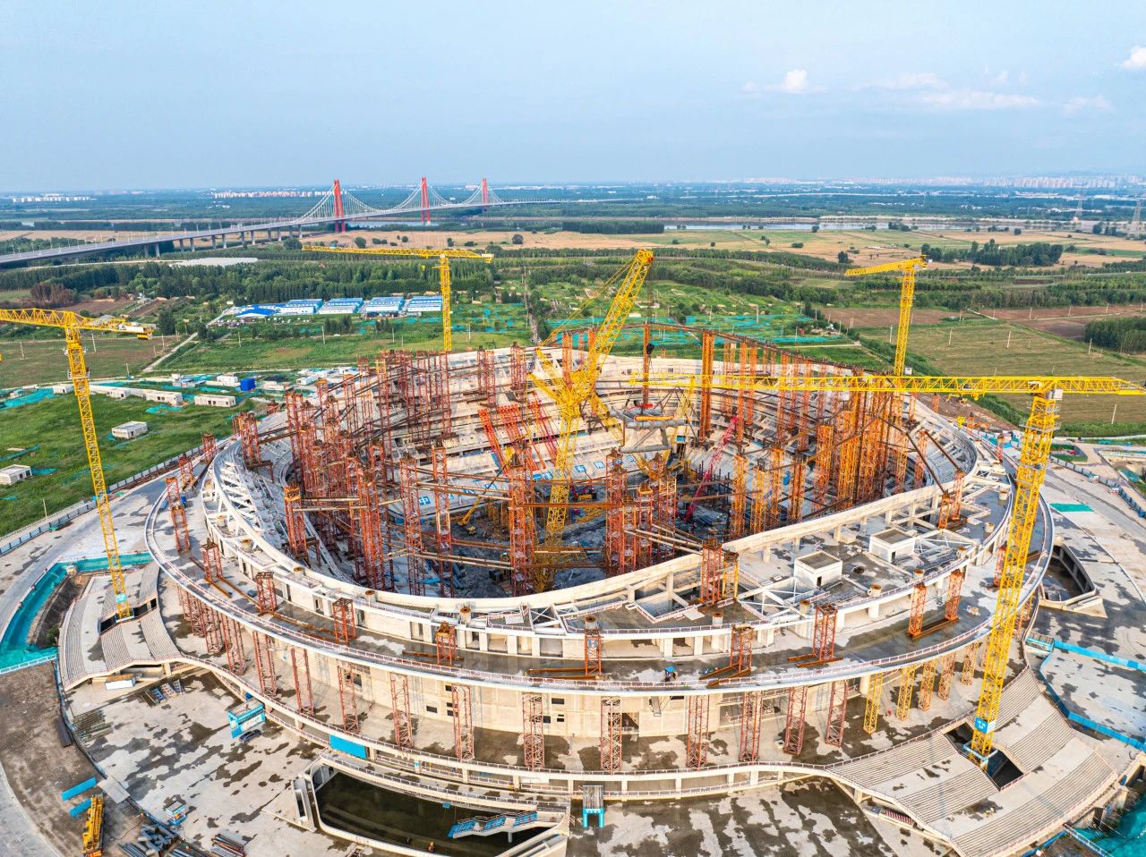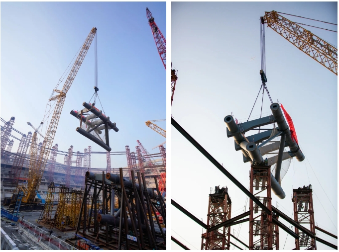 本次實施的首次吊裝段,位于內(nèi)環(huán)桁架,單元吊重達168噸,起吊縱深高達60余米。項目位于濟南新舊動能轉換起步區(qū),建筑面積19.73萬平方米,建筑高度為60米,是山東省首個6萬座專業(yè)足球場,可承辦國際、國內(nèi)重大體育賽事。同時也是國內(nèi)體育場館懸挑長度最大的工程,最大懸挑長度達到了45米,屋蓋鋼結構由星形拱桁架、內(nèi)環(huán)桁架、外環(huán)桁架、單層網(wǎng)格及挑檐組成,總鋼量約3.1萬噸,靠36根排架柱支撐,形成巨型無柱大懸挑空間,在整體結構中起到了承上啟下作用,下方排架柱與混凝土結構相連,上方支撐索結構、膜結構。項目預計在2026年底竣工驗收完成。