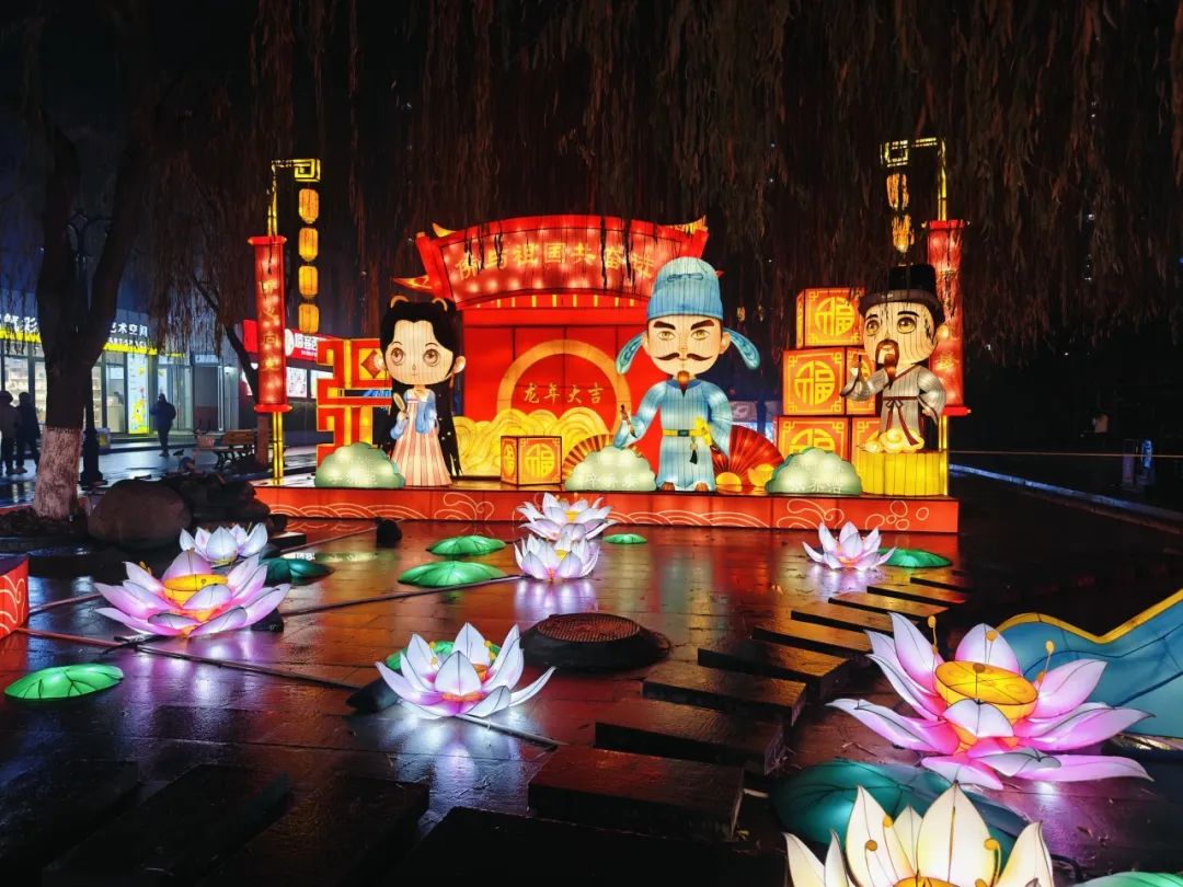 本屆燈會(huì)將延續(xù)往屆的點(diǎn)位,沿“十字”主干道設(shè)置燈組。“縱尋”龍之圖騰——群龍賀春,閃耀印象濟(jì)南·泉世界。主干道泉印路共有四大觀賞亮點(diǎn),分別是“荷”為貴、張燈結(jié)彩、瑞龍迎春、齊魯名士。“瑞龍迎春”象征祥瑞的五彩神龍翹首相迎,龍頭一抬,好運(yùn)自來。齊魯名士共有兩個(gè)展出點(diǎn)位,濟(jì)南人的榮耀和驕傲,我們的 “二安文化”作為本屆燈會(huì)的一大“看點(diǎn)”就在這個(gè)部分展出,在湖畔荷塘中,Q版的齊魯名士們,引得現(xiàn)場市民、游客紛紛拍照打卡。