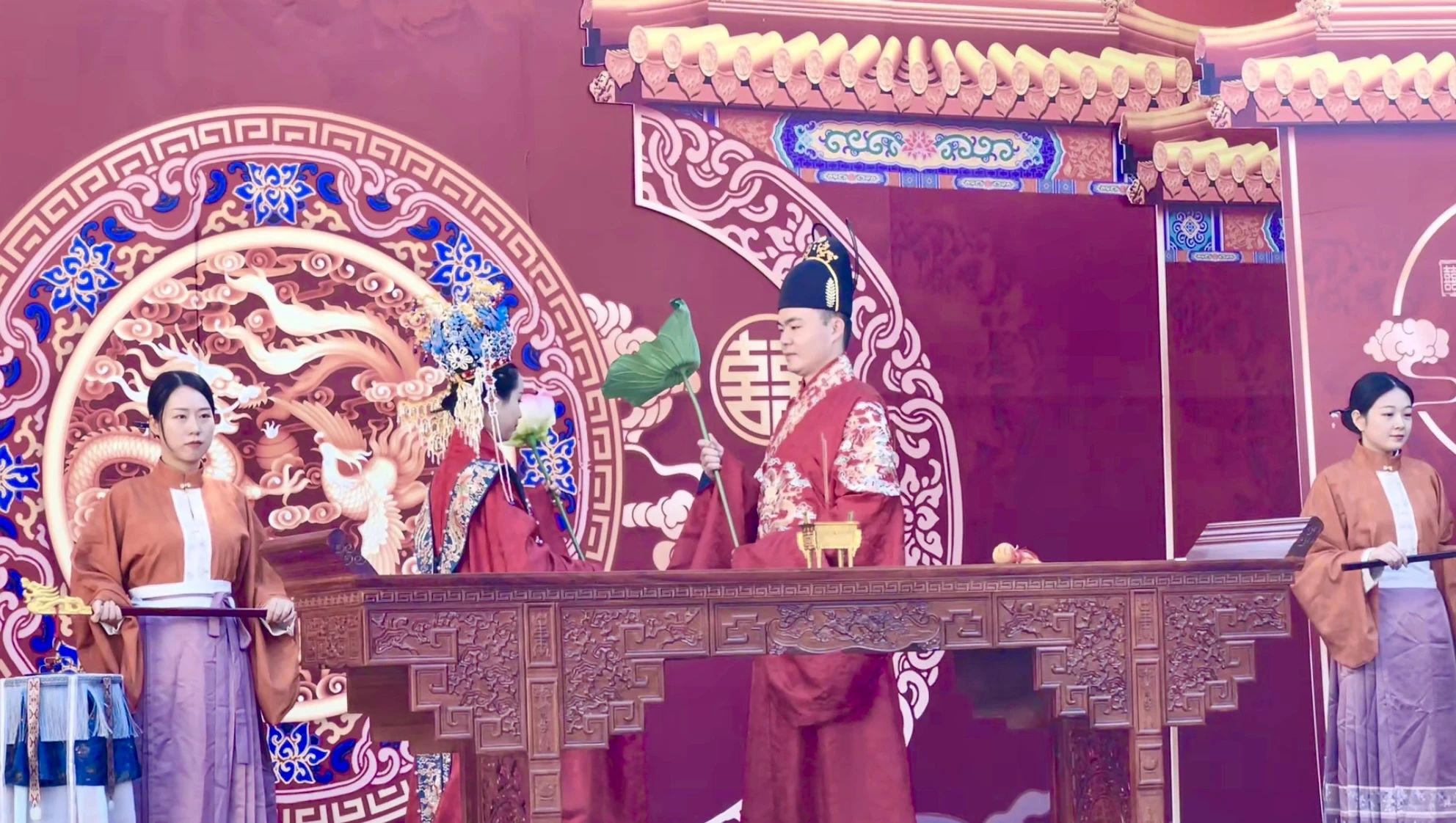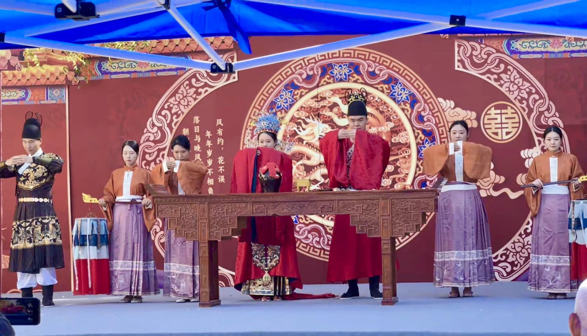 “山河月明”羅芙威宮中式婚禮展演,盛世華禮、古韻十足,演員們身著華彩衣裝,恍若穿越千古時(shí)光翩翩而來(lái),在印象濟(jì)南·泉世界東門(mén)主街,帶領(lǐng)市民游客沉浸式體驗(yàn)中式婚禮的浪漫。