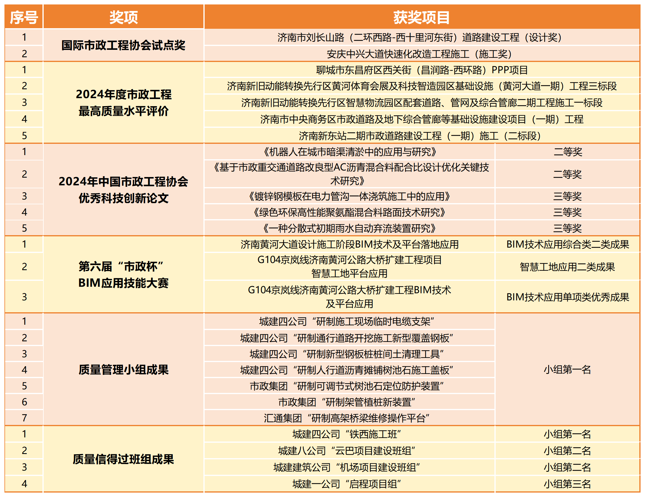 其中,濟(jì)南市劉長(zhǎng)山路(二環(huán)西路-西十里河?xùn)|街)道路建設(shè)工程等2項(xiàng)工程獲評(píng)“國(guó)際市政工程協(xié)會(huì)試點(diǎn)獎(jiǎng)”;聊城市東昌府區(qū)西關(guān)街(昌潤(rùn)路-西環(huán)路)PPP項(xiàng)目等5項(xiàng)工程獲評(píng)“2024年度市政工程最高質(zhì)量水平評(píng)價(jià)”;《機(jī)器人在城市暗渠清淤中的應(yīng)用與研究》等5篇論文獲評(píng)“中國(guó)市政工程協(xié)會(huì)科技創(chuàng)新論文”并入選《中國(guó)市政工程協(xié)會(huì)科技創(chuàng)新論文集》;城建集團(tuán)公司3項(xiàng)成果獲評(píng)第六屆“市政杯”BIM應(yīng)用技能大賽獎(jiǎng)項(xiàng),其中包括1項(xiàng)BIM技術(shù)應(yīng)用綜合類(lèi)二類(lèi)成果、1項(xiàng)智慧工地應(yīng)用二類(lèi)成果、1項(xiàng)BIM技術(shù)應(yīng)用單項(xiàng)類(lèi)優(yōu)秀成果;“研制施工現(xiàn)場(chǎng)臨時(shí)電纜支架”等7項(xiàng)質(zhì)量管理小組成果獲評(píng)小組一等獎(jiǎng)第一名;“云巴項(xiàng)目建設(shè)班組”等4項(xiàng)班組成果獲評(píng)全國(guó)市政工程“質(zhì)量信得過(guò)班組”示范級(jí)班組前三名。