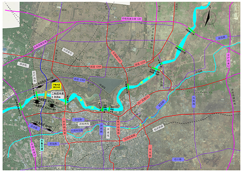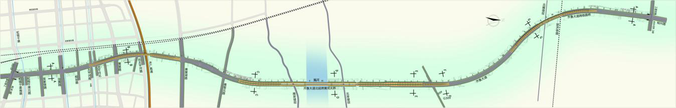一標段南起現狀濟齊路,向北與虹吸干渠南路、虹吸干渠北路、吳家堡路、治黃路、規(guī)劃路相交,采用高架形式跨越太平河南支路、太平河北支路、美里路、太平河北路、濟廣高速后,在美里湖路前落地,高架橋兩側設置一對輔道實現各交通流向的轉換,終點接黃河大橋引橋,平面線位與規(guī)劃線位一致,道路全長3671.89米。